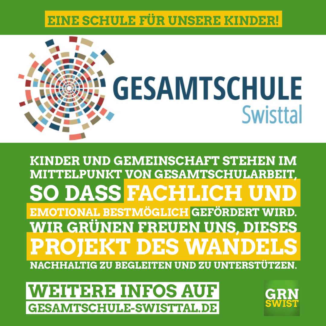 Dazu Michael Hellmich, schulpolitischer Sprecher der Grünen in Swisttal: „Ich freue mich, dieses Projekt des Wandels nachhaltig zu begleiten und zu unterstützen. Dafür braucht es jetzt mindestens 100 Anmeldungen und dafür brauchen wir Sie und Ihre Kinder. Wir als Grüne sind überzeugt, dass auch Gymnasialeltern den enormen Mehrwert für Ihre Kinder feststellen werden!“