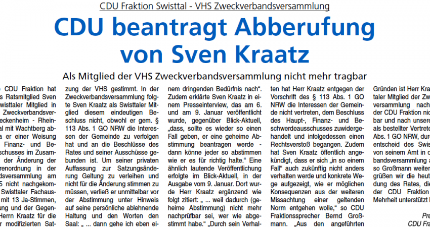 Presseerklärung zur Pressemitteilung der CDU in Blick Aktuell vom 27.02.2016 „CDU beantragt Abberufung von Sven Kraatz“