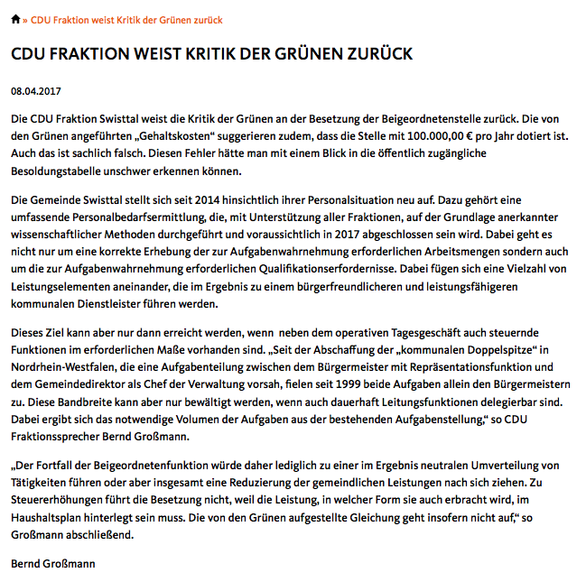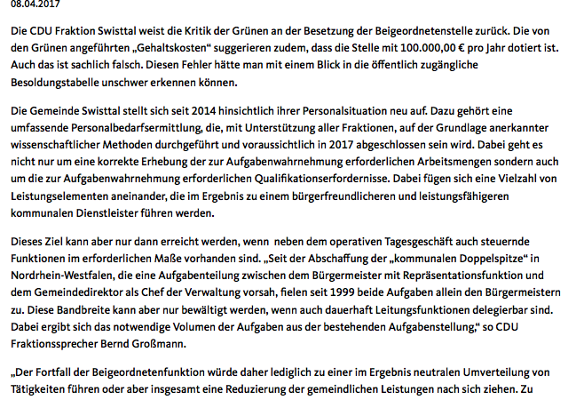 Die CDU hätte uns am besten vehement zugestimmt, statt unsere Aussagen zur Mehrbelastung durch die Stelle des Beigeordneten vehement zu widersprechen. Mit falschen und verfälschten Fakten zu argumentieren, scheint wohl derzeit groß in Mode zu sein.